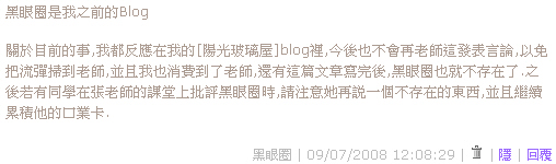 之前黑眼圈的部落格,因為上課發生的事、不想再讓班上同學去看『黑眼圈』的圖、不想要有紛擾而收掉,