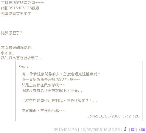 但是從下面以及目前所登出的某女的回覆可看出...某女的回覆多是鼓動、激烈...感覺上多是煽風點火的意味,真不像是個老師該有的言行...